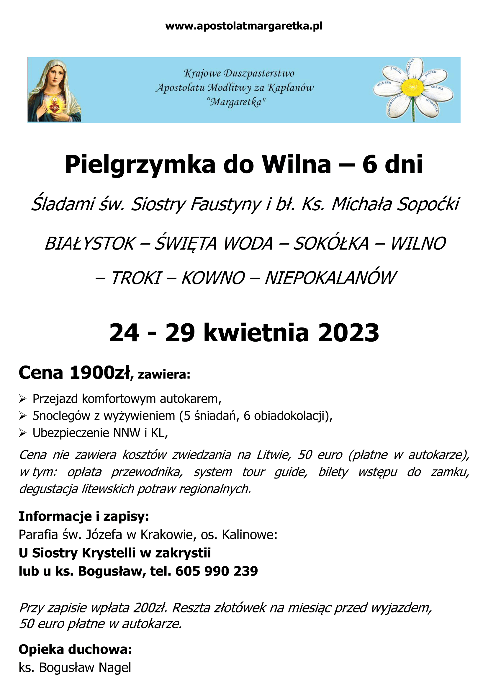 Mieszkający na terenie naszego dekanatu ks. dr Bogusław Nagel, Krajowy Duszpasterz Apostolatu Margaretka*, zaprasza na organizowane w najbliższym czasie pielgrzymki. W sposób szczególny zaproszenie skierowane jest do osób zaangażowanych w modlitwę Apostolatu. Informacje i dane kontaktowe na dołączonych plakatach.